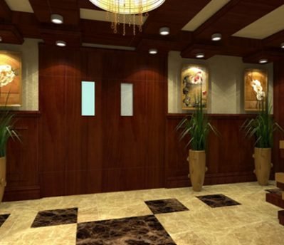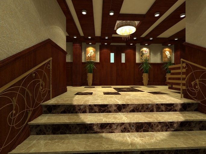 I designed the side entrance which had a big issue based on different axes for the main doors, and there was no symmetric in the space which pushed me to pick main wall to draw the attention, and convert it to the main issue in the space to treat the hall space. I picked up the wall paper, the wood molding and the coloring, but floor materials were chosen from the beginning. I presented the design in AutoCAD and 3D Max rendering.