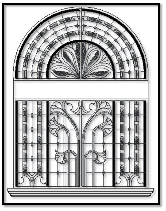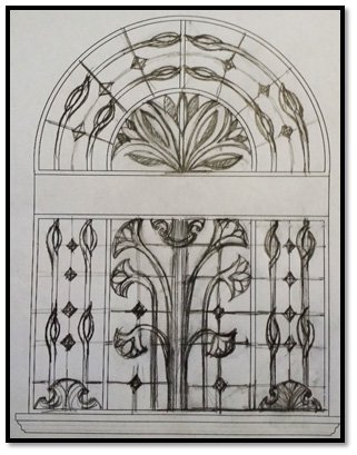 I designed a stained glass window as a freehand sketch in the beginning to match this element with the style which was picked at the hall.There was a large mosaic banner which belongs to plants molding and historic Style, so I inspired the idea to match the banner and all the other elements in the hall. The design has a strong conceptbased on all the principal design such as symmetric, harmonic, and balance